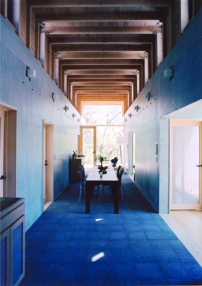 Each room connects to the hall, and a decked terrace (an opan space) is swered with the axis. The hall is designed as studios to do various activities. Both sides of the hall is RC wall construction. A roof of the hall is wooden construction. A floor of the hall is covered by developed building blocks made from decomposed granite with underfloor heating. It is confortable to walk with bare feet on the floor.